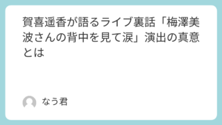 アイドルイベント 賀喜遥香が語るライブ裏話「梅澤美波さんの背中を見て涙」演出の真意とは 乃木坂46賀喜遥香がライブ裏話を語る。「梅澤美波さんの背中を見て涙」と明かした演出の背景をまとめます。 2026.03.03 アイドルイベントアイドルニュース乃木坂46