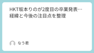 アイドルニュース HKT坂本りのが2度目の卒業発表…経緯と今後の注目点を整理 HKT48坂本りのが2度目の卒業を発表。公式コメントをもとに経緯やファンの反応、今後の注目点を整理しました。 2026.01.23 アイドルニュース